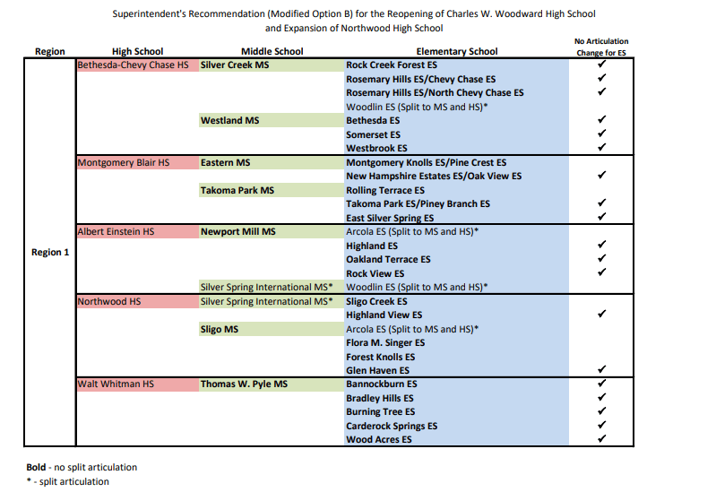 The three new options (E-G) are being considered in addition to the four options (A-D) released in October, none of which include changes to the Whitman cluster. Information about all of those options can be found here. After receiving some clarification from MCPS, we are less concerned about the initial four options from the spring resurfacing, though the new MCPS survey has an optional field for respondents to provide feedback on those options.